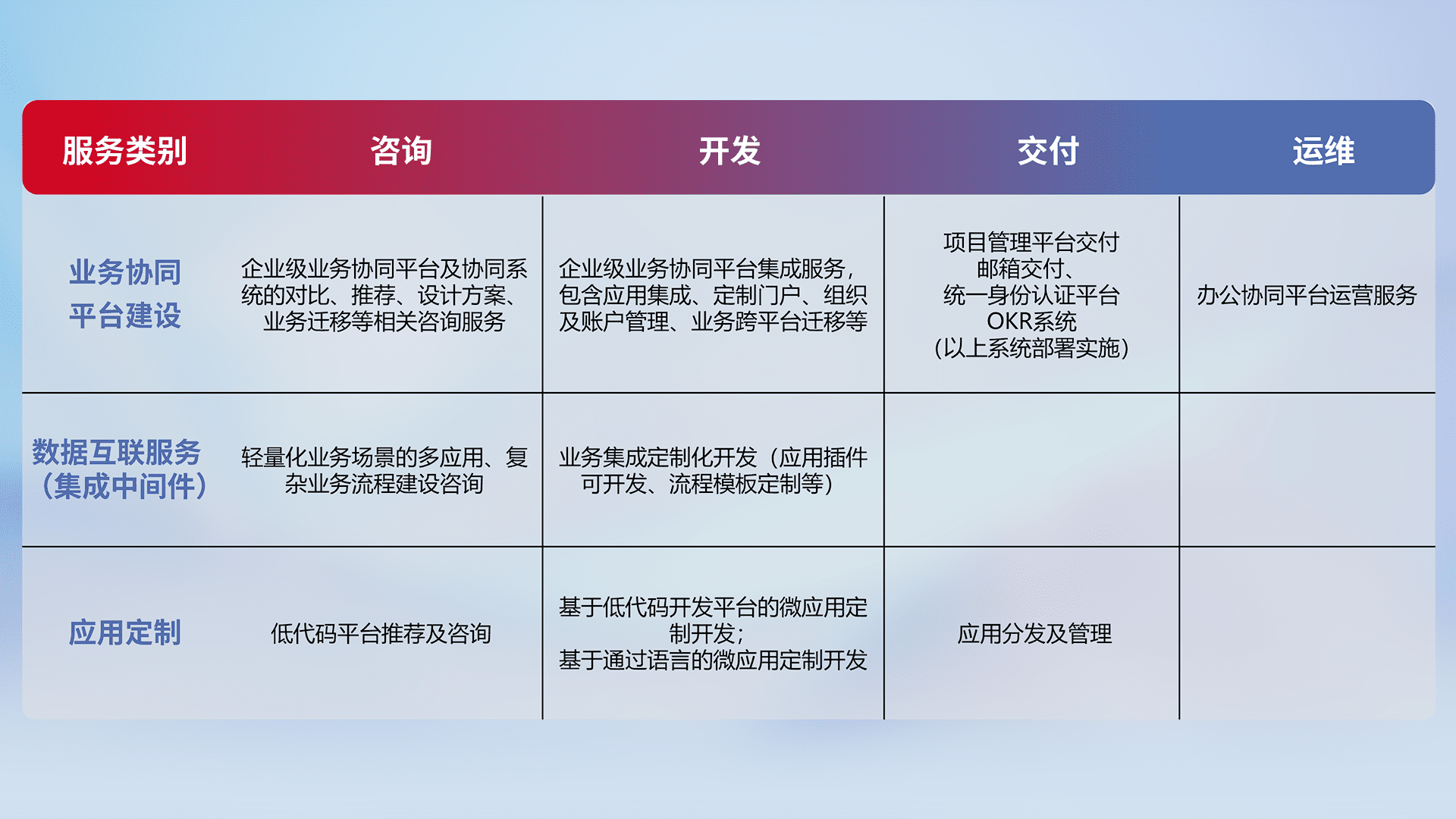 针对钉钉、、、企微、、、、IDaas等平台级产品提供产品的规划、、方案、、、交付、、、定制化开发等服务,,实现如统一协同办公、、、智能客户服务、、、混合会议管理、、、、智能数据查询、、、、等业务场景,,,实现数字化转型。。。。