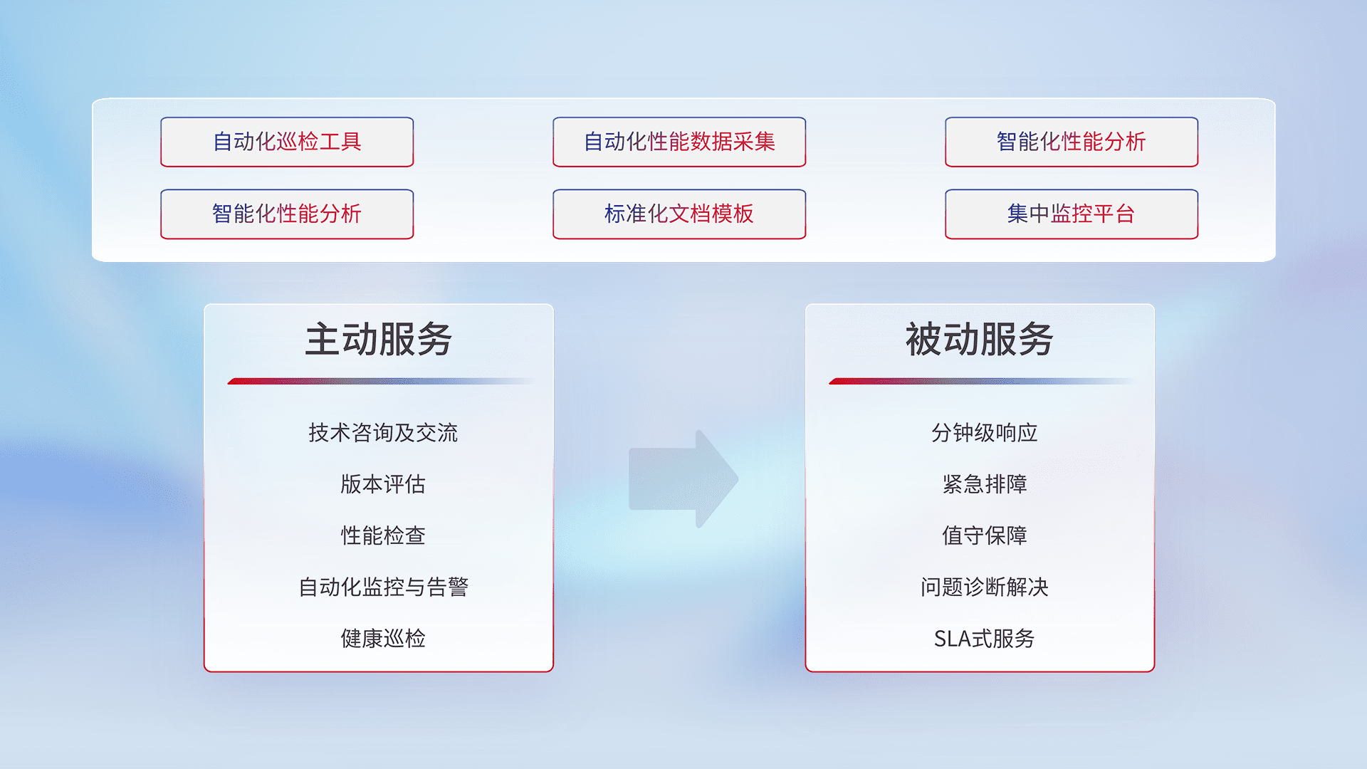 智能化工具和标准化文档,,保障服务质量,,,提供主动服务(包含技术咨询、、版本评估、、、、性能检查、、、、自动化监控与告警、、、健康巡检)和被动服务包含(分钟级响应、、、紧急排障、、、值守保障、、问题诊断解决、、、SLA服务)。。。。